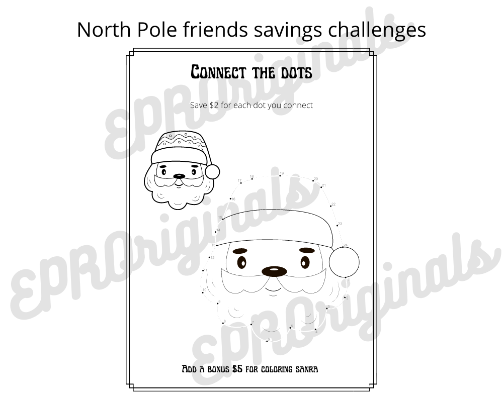 Triple the fun for adults or kids. Connect the dot savings challenges offer you 2 options on how to save. You can save the same dollar amount for each dot you connect as labeled. If you want a bigger challenge you can also save the dollar amount of the dot number. This is 1 of 3 sets with a Christmas theme. These 3 savings challenges feature friends you might meet at the North Pole.