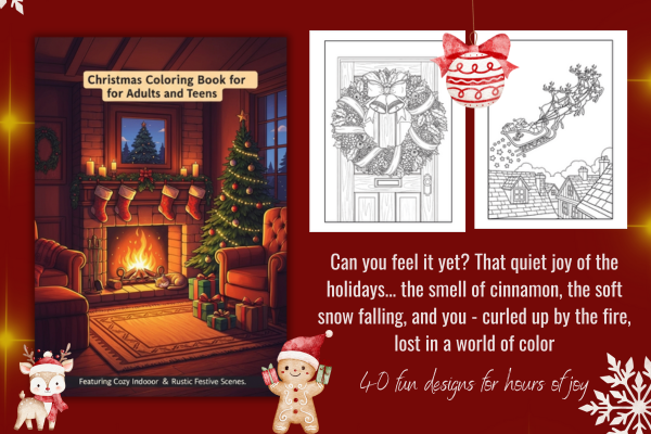 Dive into the festive spirit with our 'Christmas Coloring Book for Adults and Teens: Featuring Cozy Indoor & Rustic Scenes Festive Scenes,' where every page invites you to unwind and unleash your creativity. This beautifully curated collection features 40 adorable and stress-relieving holiday designs, perfect for adults seeking a peaceful escape during the bustling holiday season.