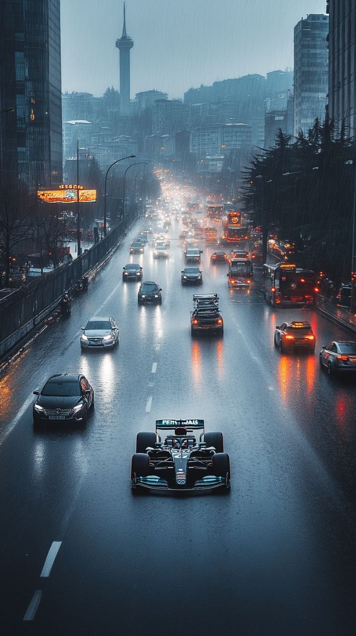 Cinematic Formula 1 Street Racing Prompt – Mercedes Race Car in Rainy Istanbul Fog (Midjourney v7)