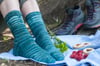 The socks feature a simple slipped stitch pattern at the cuff that brings to life the places where mountain, sky and sea meet. Although the colorwork looks complex, it’s easily created with slipped stitches and is designed for beginning sock knitters.