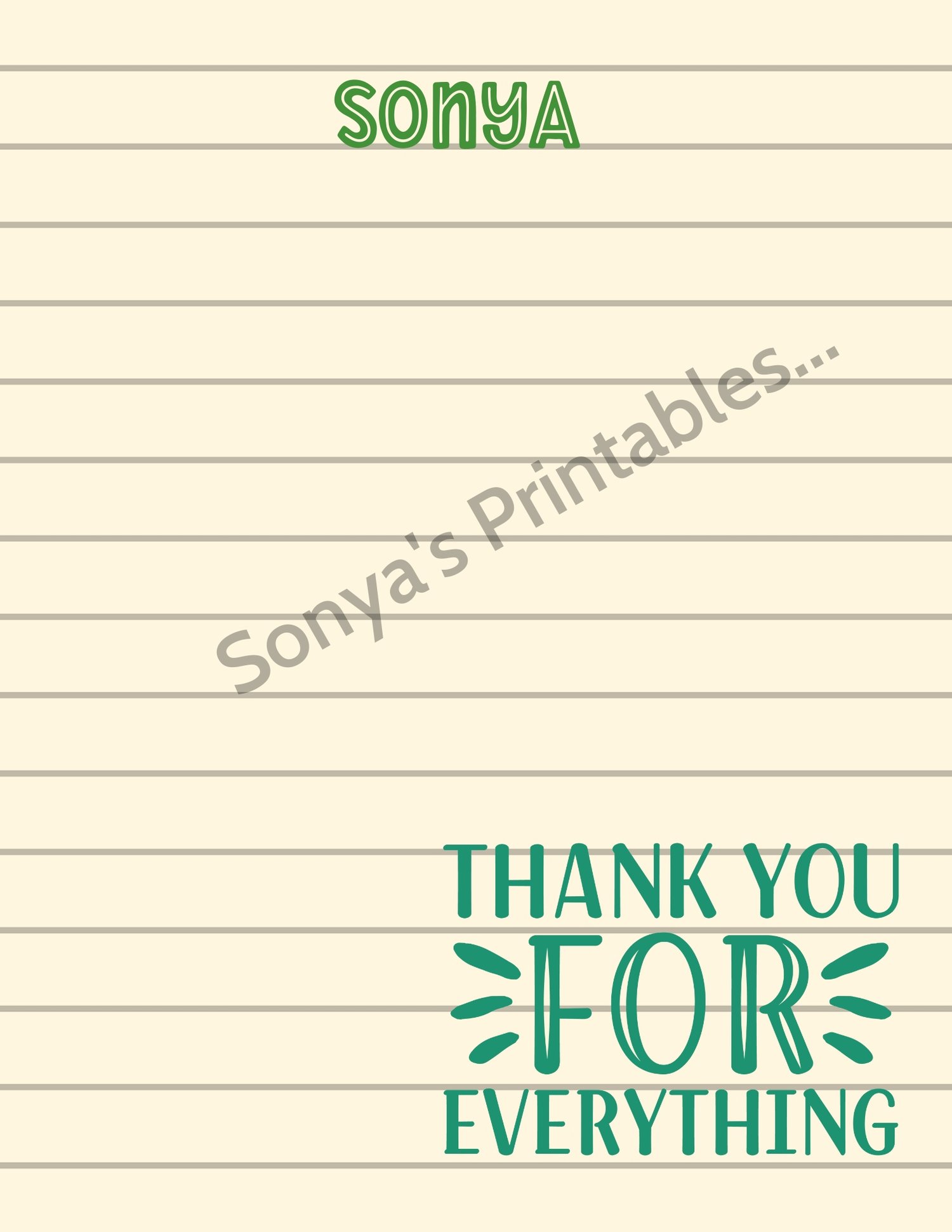 Say "💚Thank You💚" in style with this personalized, printable stationery - perfect for heartfelt notes or a special letter. Its unique design will capture attention and evoke emotion – spread your gratitude with style! Each of the SEVEN note papers are different and eye-catching!