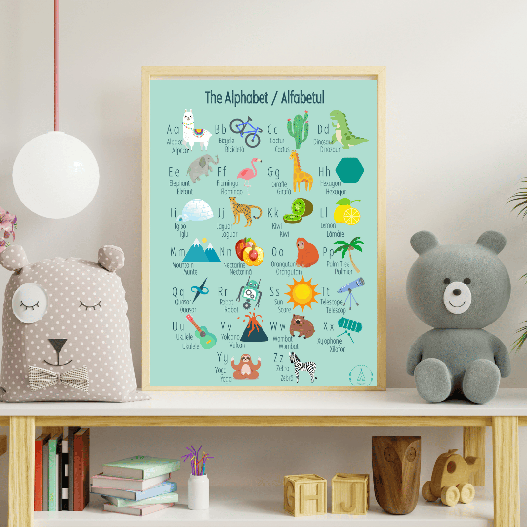 Poster boardul bilingv "Alphabet Board" este un mod educational de a invata prin joaca.