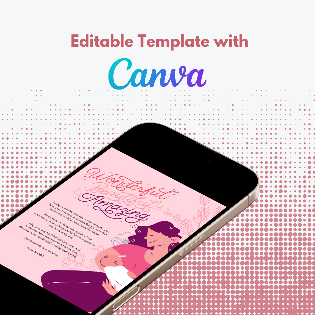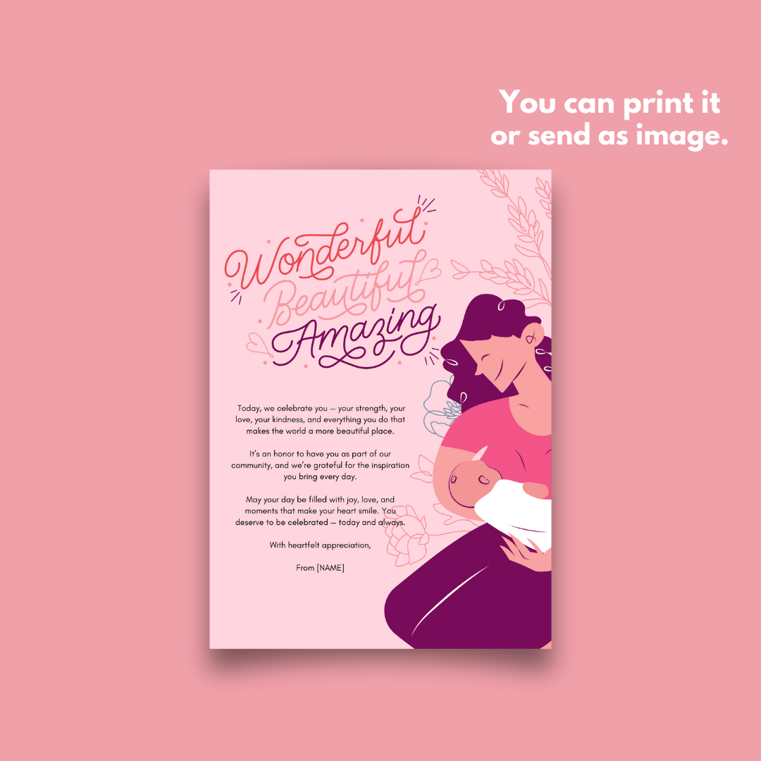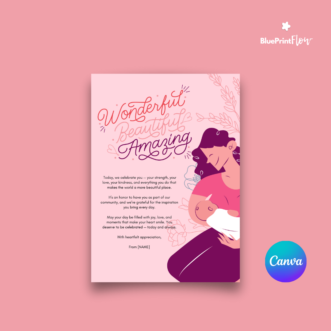 This Canva template features a heartwarming illustration of a mother and baby, paired with uplifting words like Wonderful, Beautiful, Amazing — perfect for expressing gratitude and affection.