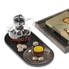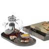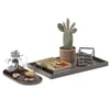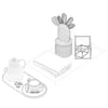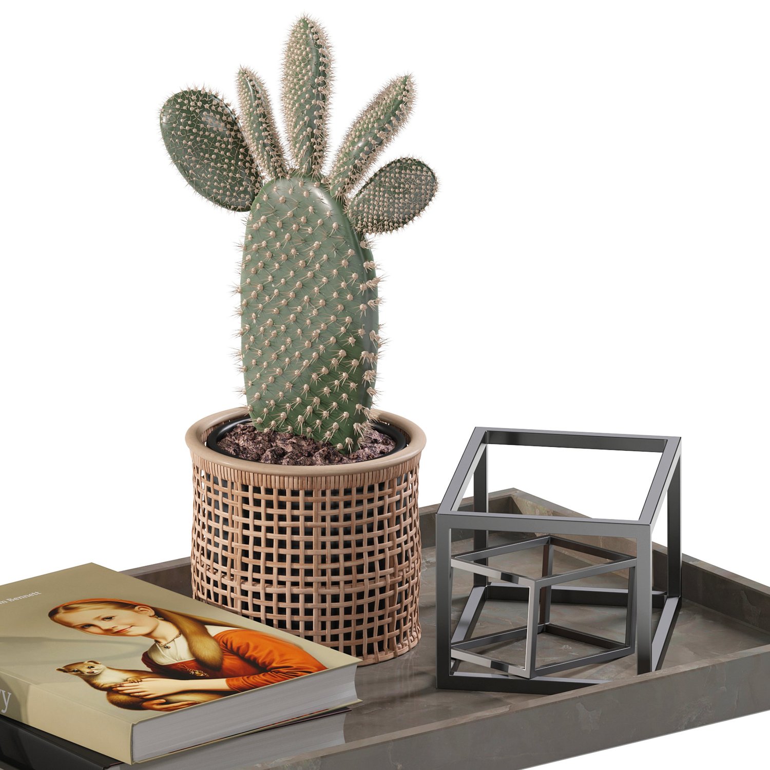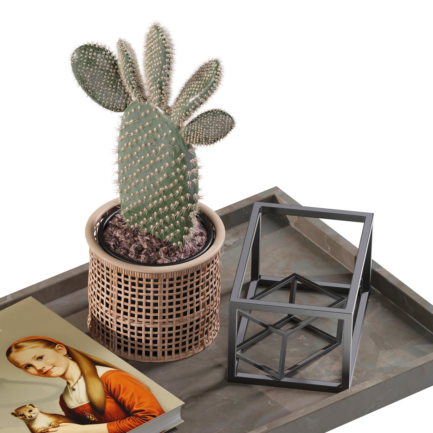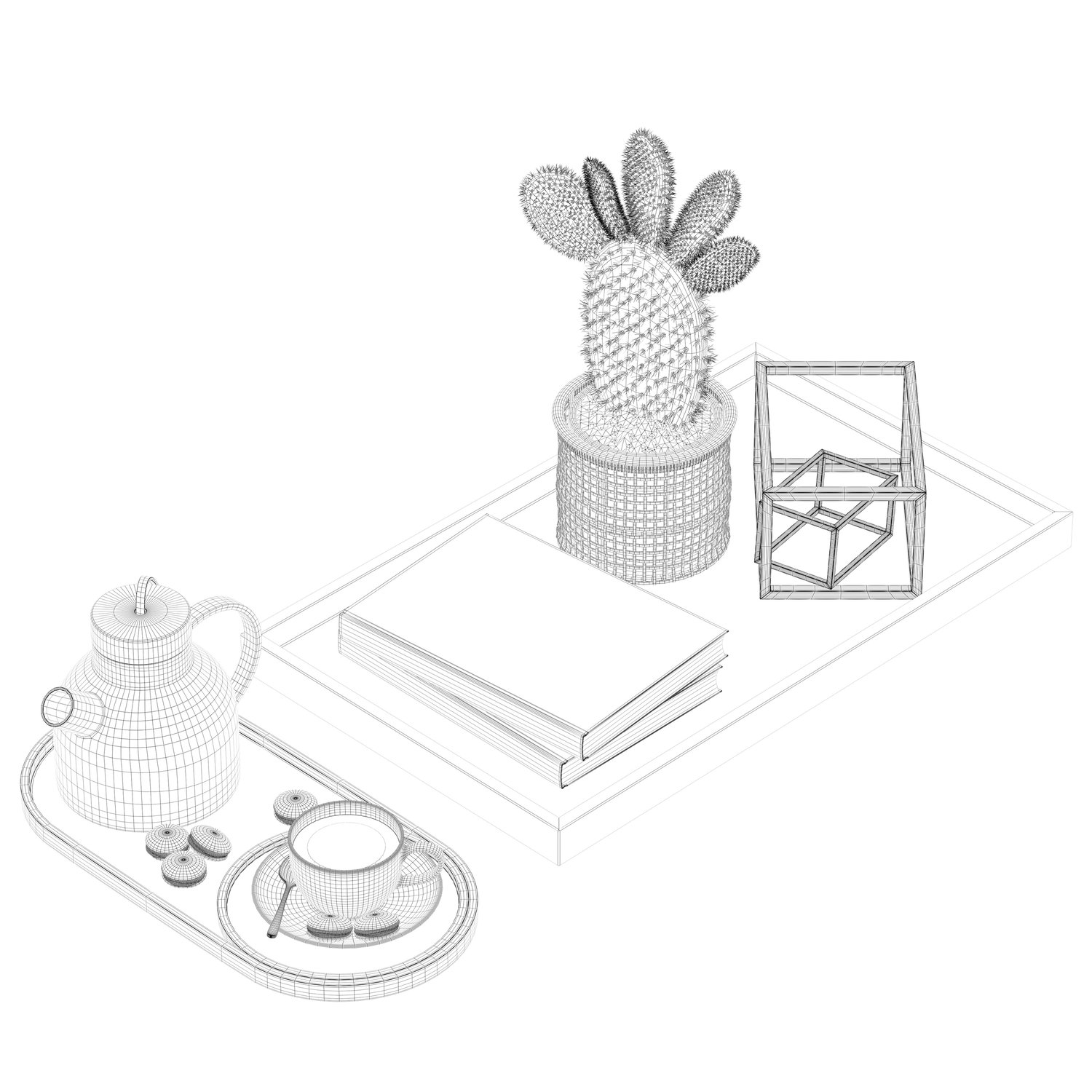 • tray• figurine• tea cup with lemon• books• macaroons• tea pot• plant in rattan pot