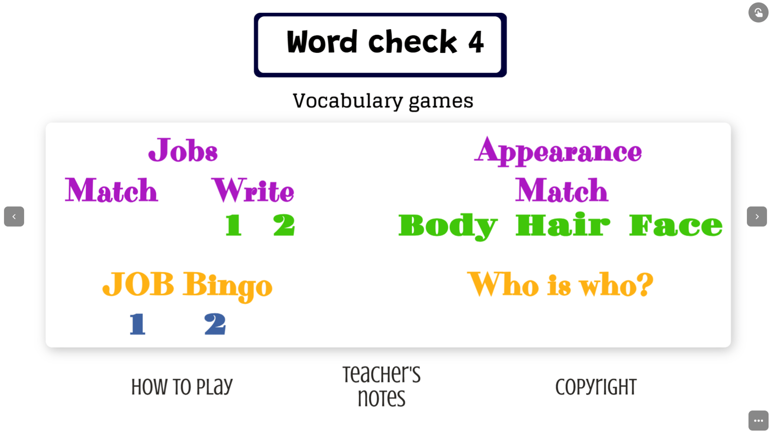 Let’s play some words. Here comes another set of nice vocab for kids. Check the match activities or practice writing. Open, click and play. Discover fun pictures to give your lessons more color. It’s all ready to go. Have fun with our interactive presentation. No prep, pure fun!