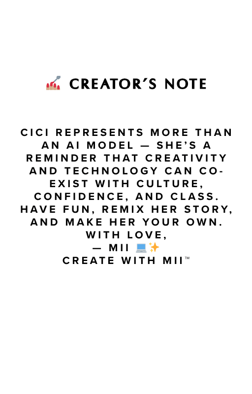 - 🪞 Usage & Consistency Guide — keeps CiCi cohesive across Whisk & Veo.