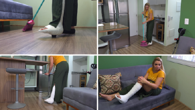 After learning to walk with the SLWC, Andrea cleans the apartment, sweeping the floor and cleaning the furniture. Then she decides to watch some TV.