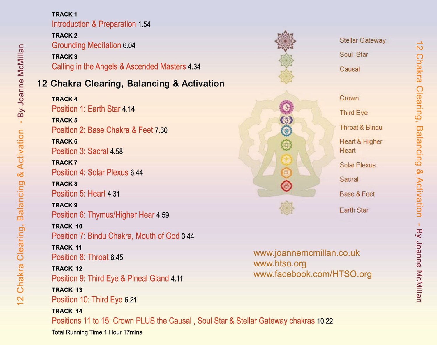 Track 14 Crown Chakra PLUS the transpersonal chakras above the Crown, the Causal Chakra, Soul Star Chakra and the Stellar Gateway. Spend time paying attention to each chakra.