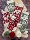 Samples are knit in Barrett Wool Co. Wisconsin Woolen Spun Worsted (100% American wool; 250 yds / 228 m per 100g skein). For four stockings, CC (white): Birch – 4 skeins, MC (red): Jam – 2 skeins, MC (green): Laurel – 2 skeins