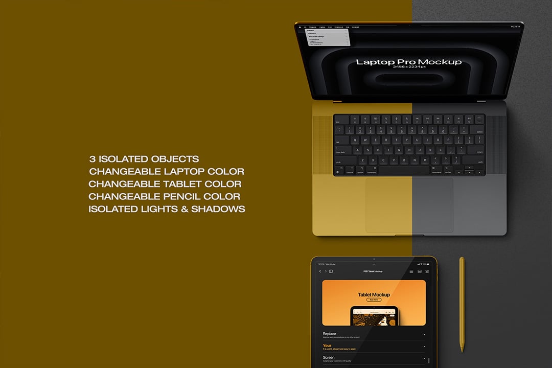 Photorealistic laptop and tablet mockup pack featuring 3 isolated objects in a flat-lay scene: a MacBook Pro 16, an iPad Pro 13, and an Apple Pencil, with changeable device and pencil colors, editable Smart Objects, and independent lights & shadows — 7000 × 5000 px at 300 DPI.