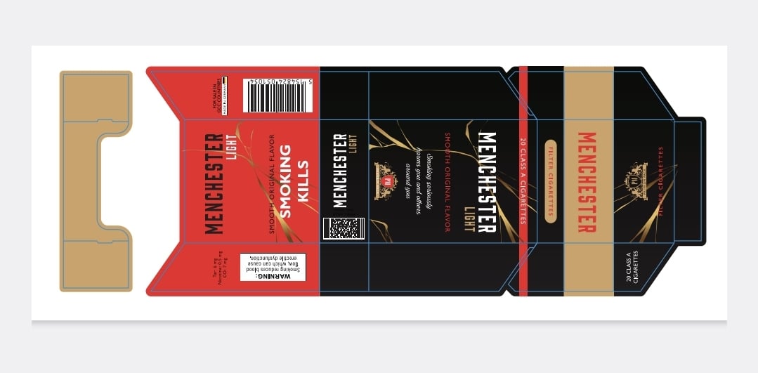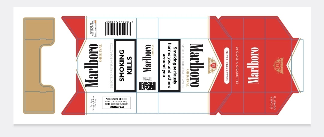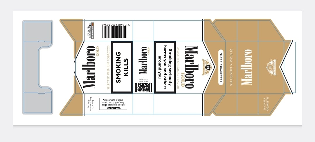 This is a digital design template for creative or illustrative purposes only. Not for actual tobacco product production. Health warning text and images are for placeholder use and should be updated for legal compliance if used in real packaging projects.