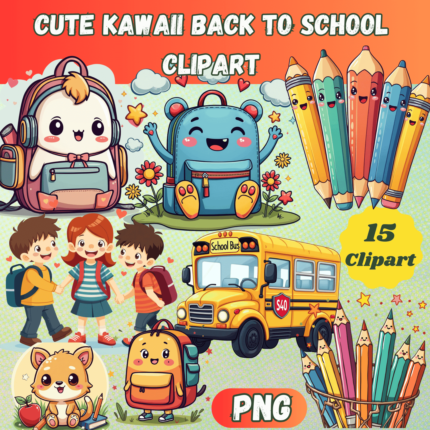 The Cute Kawaii Back to School Clipart set features a delightful collection of adorable, charming, school-themed illustrations in the popular Kawaii style. These cute clipart images include smiling school supplies, happy students, cheerful teachers, and fun educational elements, all designed to add a touch of sweetness and whimsy to back-to-school projects and materials. With their bright colors, cute faces, and playful designs, this clipart collection is perfect for creating engaging and cheerful content for the back-to-school season, such as posters, worksheets, cards, and more.