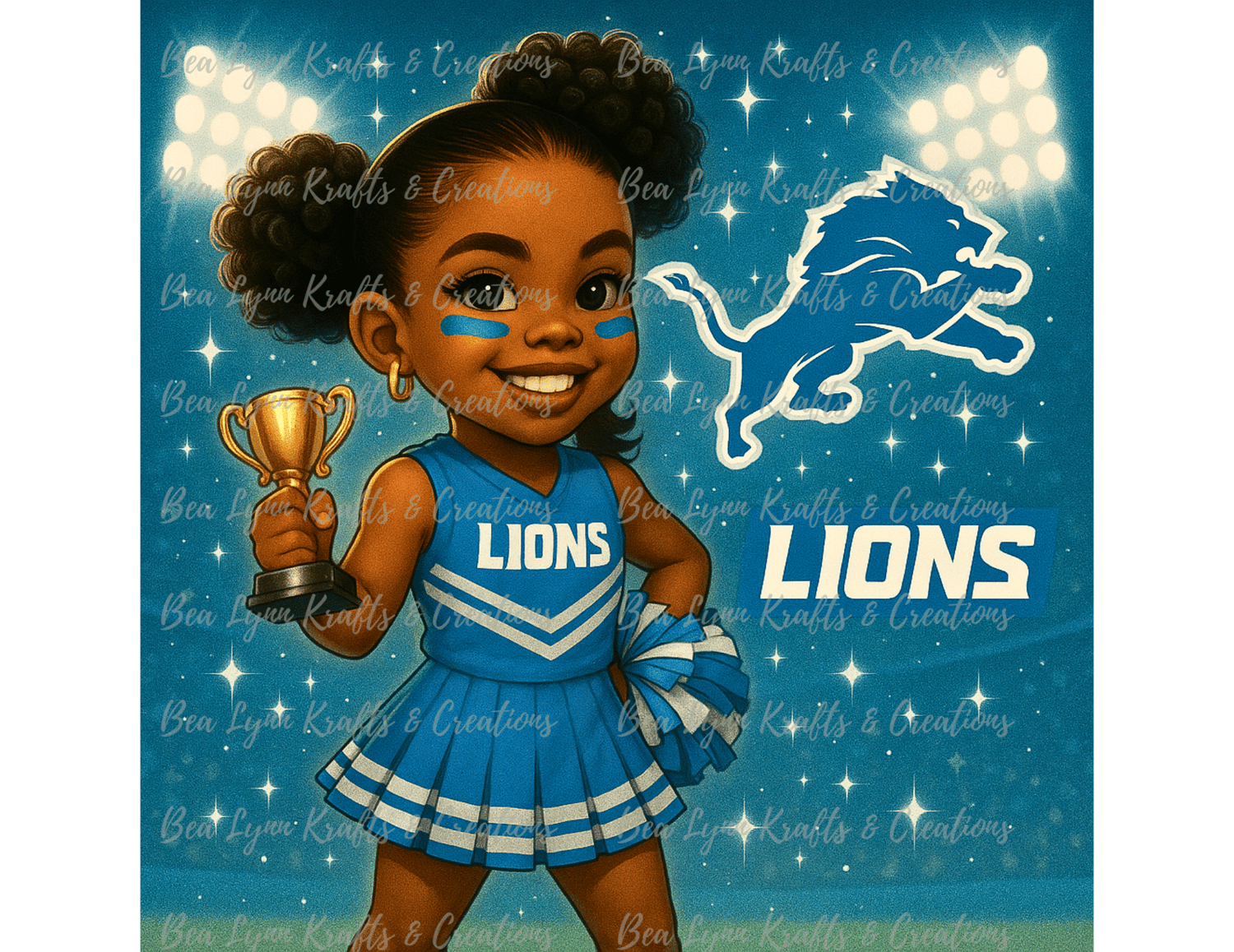 This Detroit Lions Cheerleader Girl PNG showcases an adorable 3D-style cartoon cheerleader celebrating with a golden trophy in hand. She wears a bright blue Lions cheer uniform with white accents, matching face paint, and stylish gold hoop earrings. Her curly puff ponytails and sparkling smile add charm and personality, making this design perfect for uplifting, spirited game-day crafts.
