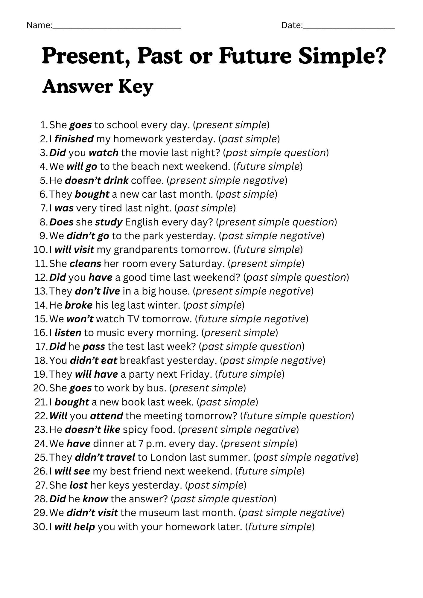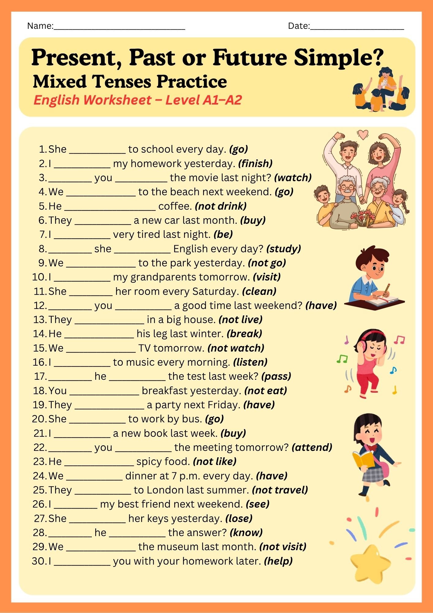 English Grammar Worksheet – Past, Present & Future Simple Tenses (A1–A2 Level) | 30 Sentence Exercise + Answer Key