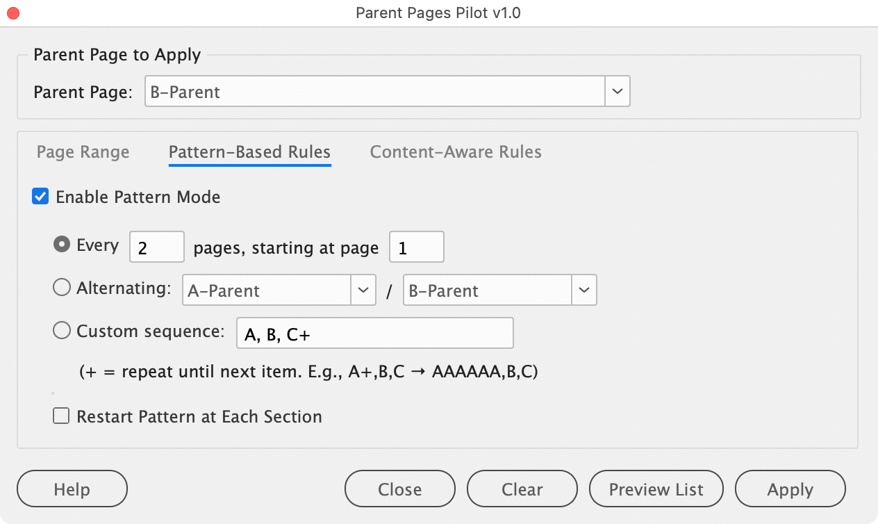- Pattern-Based Rules — Apply parent pages using repeating numeric intervals, alternating pairs, or fully custom letter-based sequences.