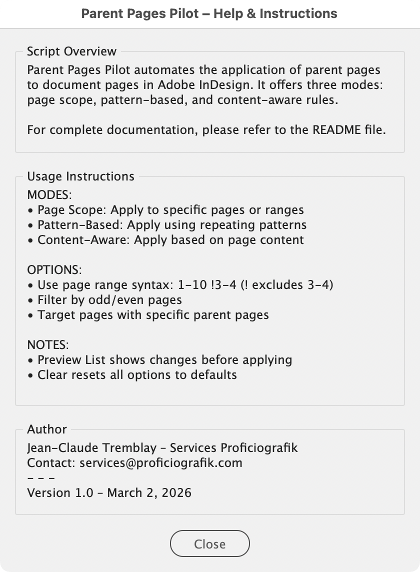 - Page Range — Apply a single parent page to a targeted page scope (range, all, active page, active spread, or Pages-panel selection).