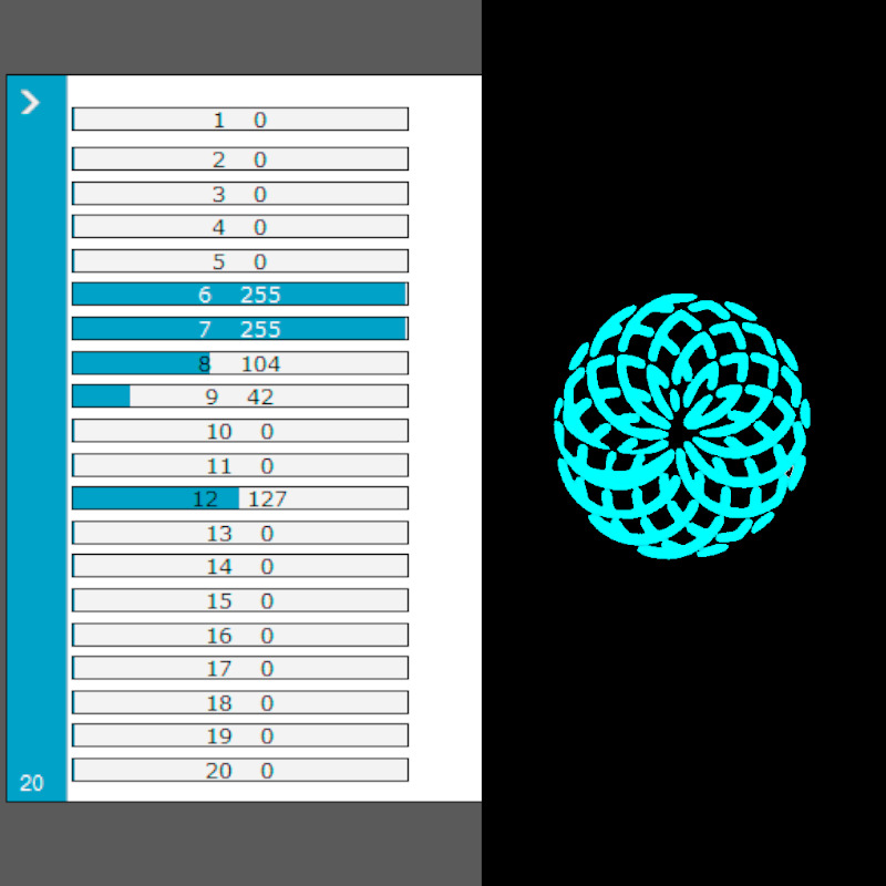 * Verifique que coincidan estos canales: 6 Dimmer, 7 Strobo/Shutter, 8 en el valor 104 = Color Celeste, 9 en el valor 42 = Gobo de la cuarta foto, 12 Foco.