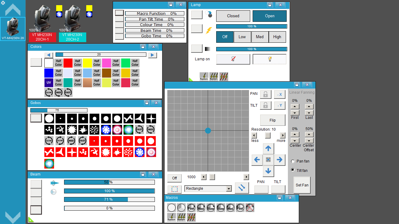 • Velocidades de Pan/Tilt, Gobos, Colores y Beam.