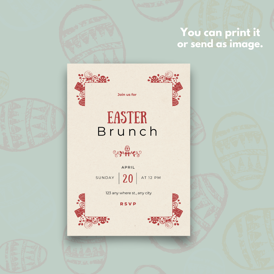 This editable Happy Easter invitation template is perfect for your Easter brunch or party. Featuring a festive design with Easter bunnies, colorful eggs, and spring-inspired motifs, this printable and downloadable invitation is easy to customize with your text. Ideal for planning your family and friends' Easter events in April, this invitation captures the spirit of rebirth and joy. Send it as a message or print it to share with loved ones. Plan your event today and make this Easter unforgettable!