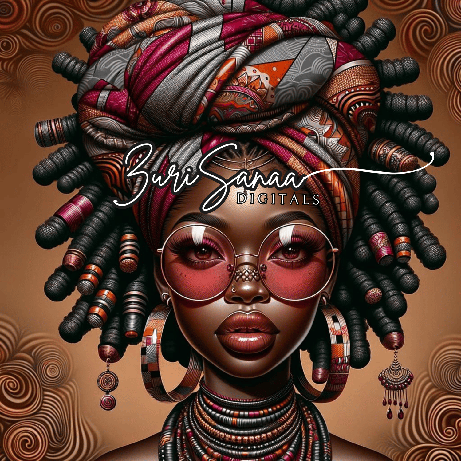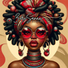 This exclusive collection features 10 high-quality PNG images of a beautiful black woman adorned with a really high, intricate turban. Each image is an extreme caricature hyper-realistic digital illustration, capturing the essence of her unique style and personality. The turban combines colorful Ankara patterns in various combinations, including coral, burgundy, grey, and more. Each image showcases a different color variation, providing a versatile and vibrant collection for multiple uses.