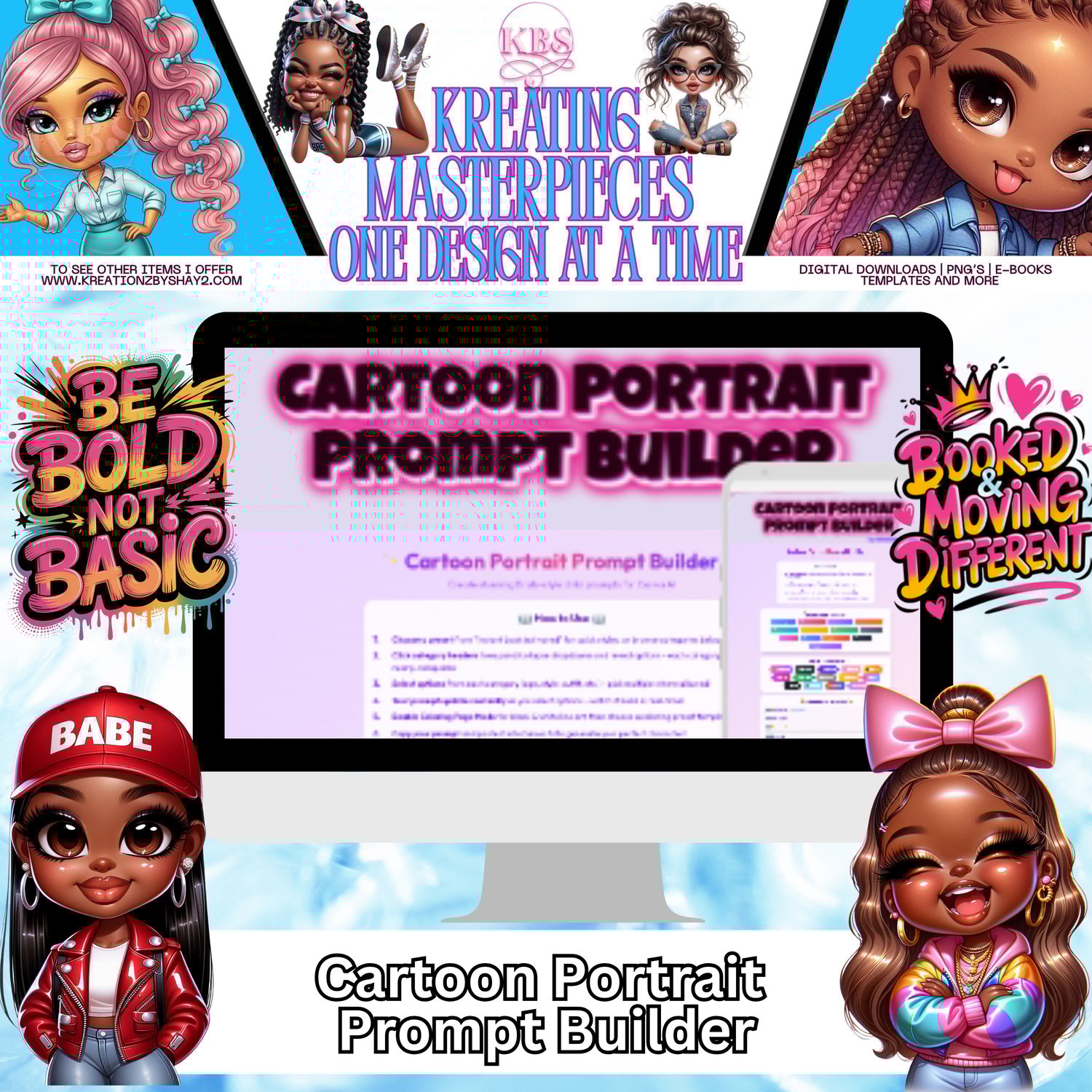 The Cartoon Portrait Prompt Builder is your plug-and-play system for creating high-quality, scroll-stopping cartoon portraits using AI. Whether you’re building chibi dolls, glossy Bratz-inspired characters, soft kawaii avatars, or bold street-style cartoon art — this builder gives you the exact structure to generate consistent, polished results every time.