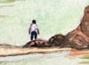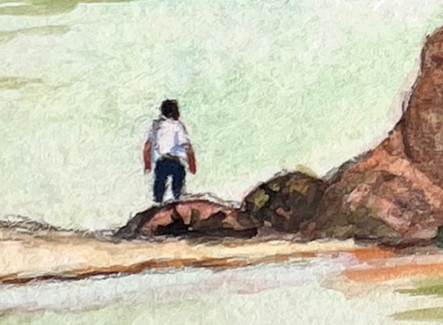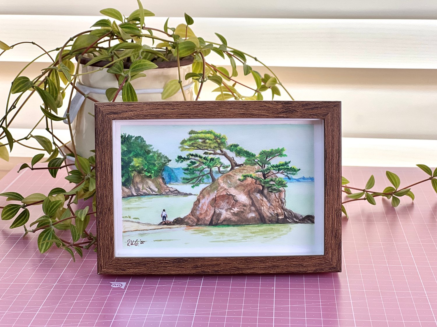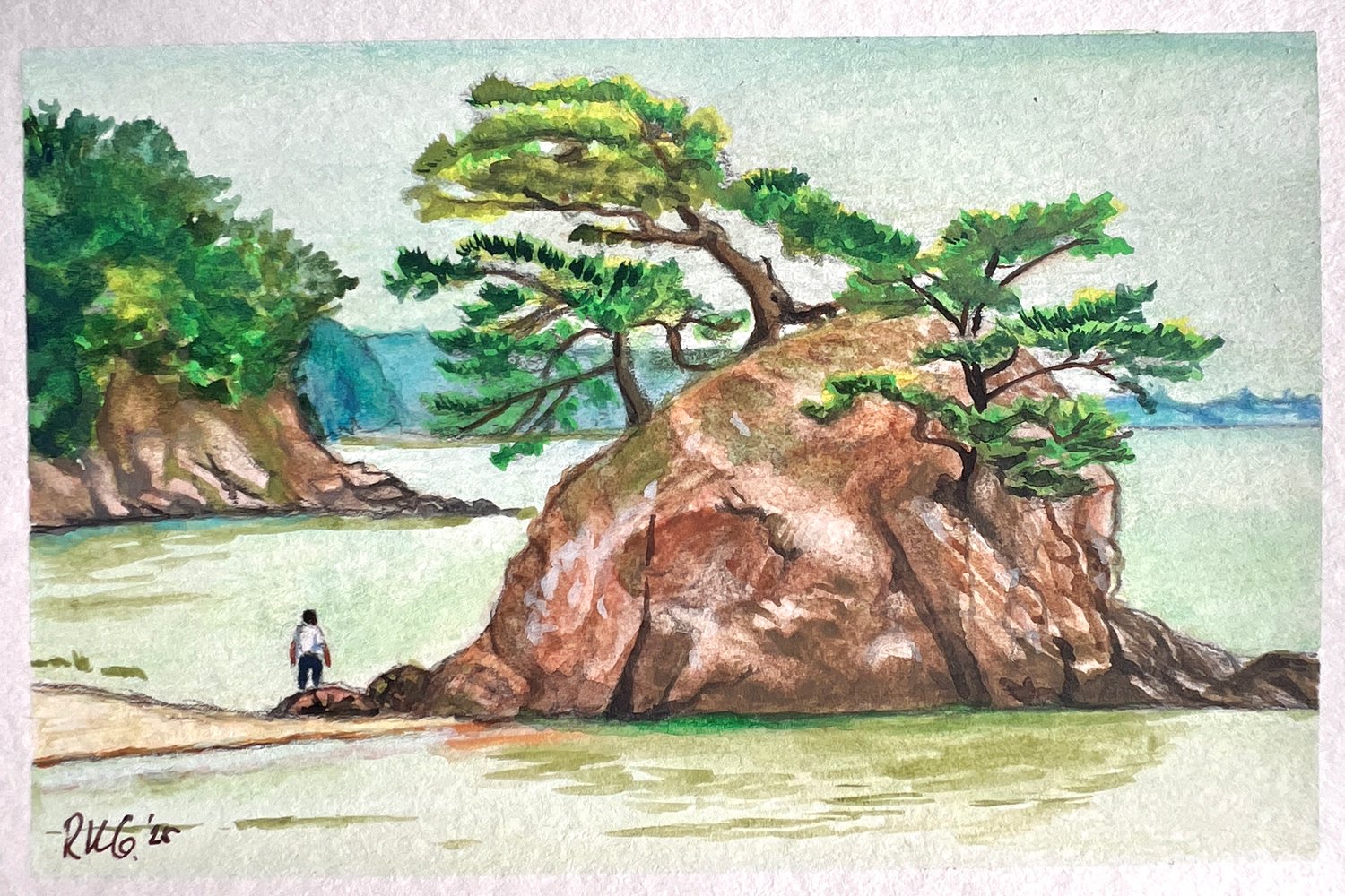 My extended family has ties to Seocheon in South Korea, and when I visited here for the first time, I was enchanted by the dramatic shapes of the myriad rocks and islets jutting out of the sea, many topped with graceful pine trees that were twisted and shaped by time and tide. It was very hot when I walked along this shore, and the sea haze cast an ethereal greenish-yellow light all around us, the color itself cooling and soothing in that muggy heat. I tried to express my own sense of wonderment through the body language of the man standing by the islet. I somehow had a feeling he could feel the power of the place as much as I did. Download and print this postcard-sized 4x6-inch painting for a little piece of South Korea in your own home, today!