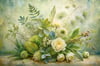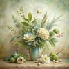 This high-resolution floral painting features a stylized botanical composition with soft greens and earthy tones. Rendered in watercolor on a textured paper effect, it creates a calm, soothing atmosphere ideal for wellness-focused interiors or digital decor. With intricate details and a natural palette, this artwork evokes peace, balance, and elegance. Perfect for printing or digital use.