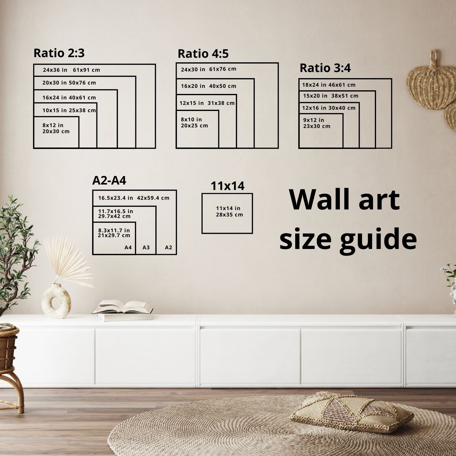 Please see the Wall art size guide in the photo gallery of this product for more information.