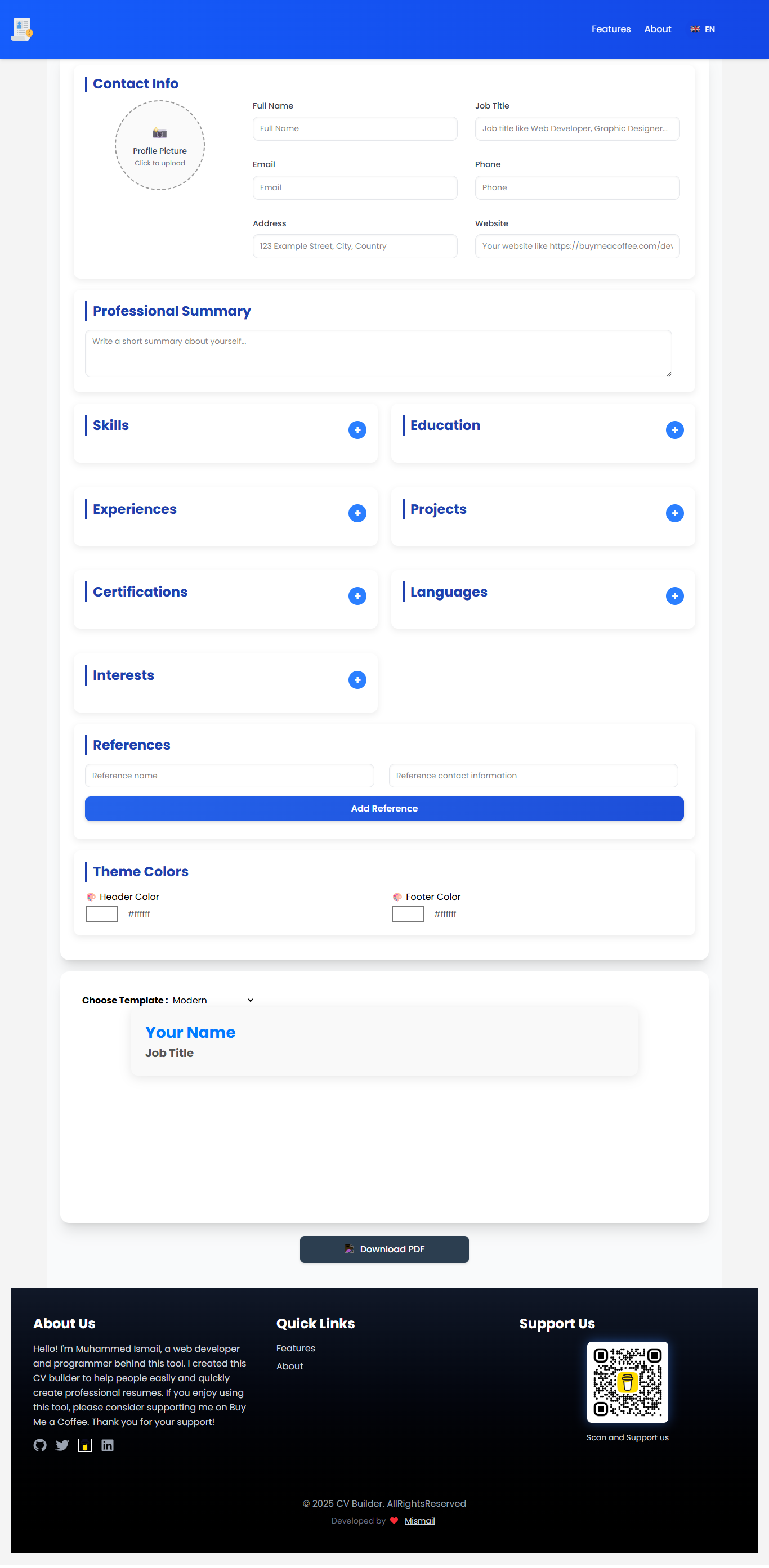Unlike static templates, this interactive resume maker is designed to help you create a modern, professional, and personalized CV without hassle. It saves you time, enhances your presentation, and gives you a competitive edge in the job market.