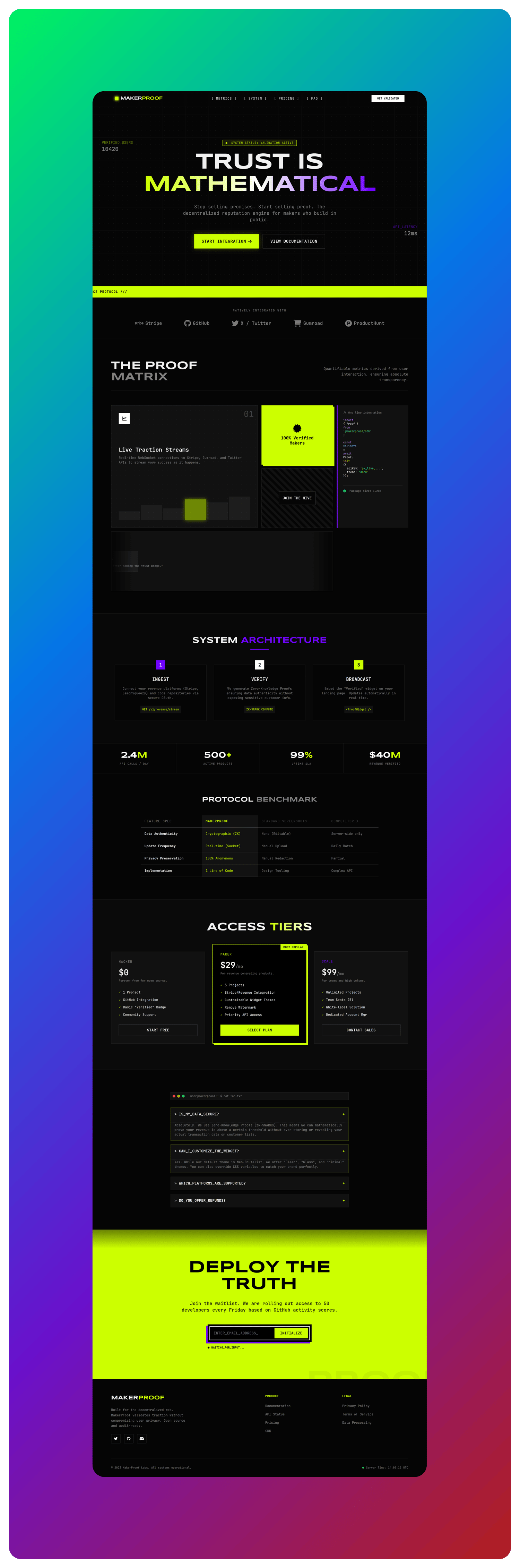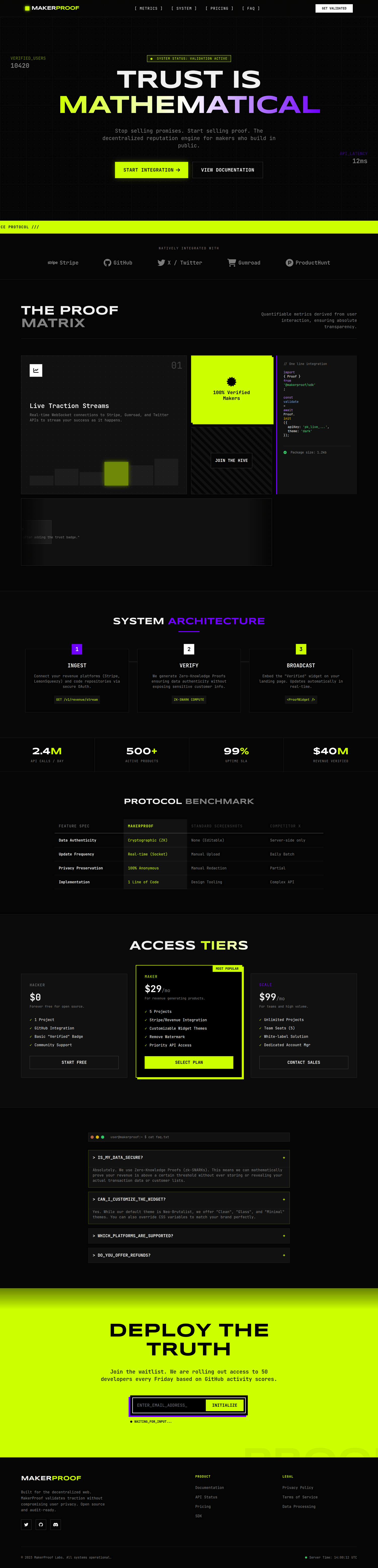 With glitch effects, neon accents, Tailwind styling, and a powerful layout architecture, MakerProof helps you turn raw validation into sales, users, and investor confidence.