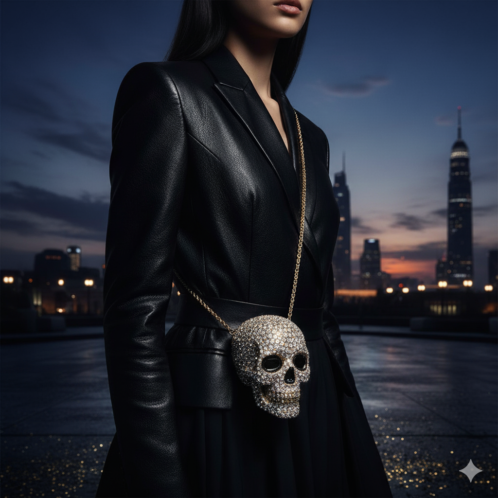"Where twilight magic meets dazzling glamour. The Midnight Glimmer Skull Purse is a masterpiece of radiant crystals and golden intrigue. Its iconic skull silhouette, beautifully embellished, offers a bold and luxurious accessory that captivates with every sparkle. A must-have for those who embrace unique style."