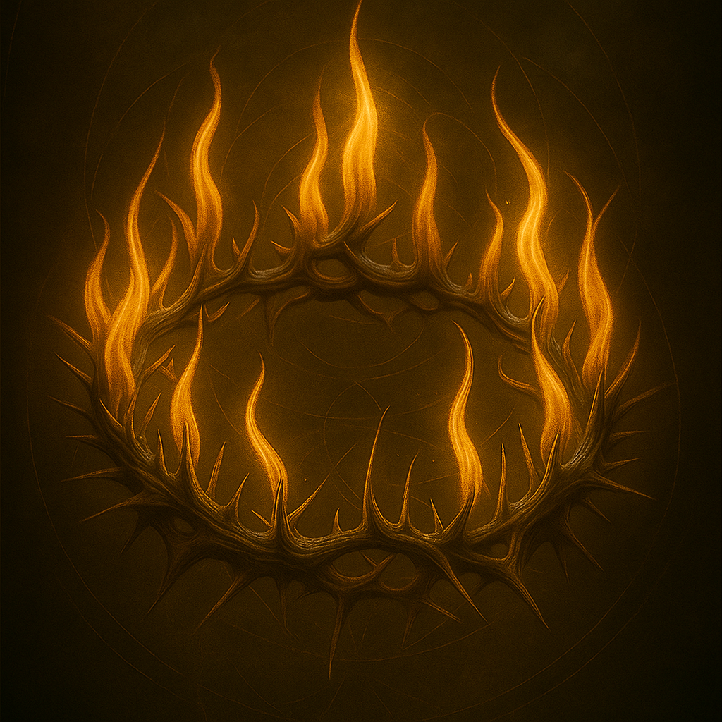 A crown of thorns, dry and forgotten, meets fire — and does not vanish. Each point becomes a tongue of light, each curve a petal of burning. What once pierced now illuminates, pain itself lifted into brilliance. Cruelty is not erased but transfigured: scar turned into hymn, wound reborn as radiance.