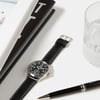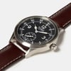 Brushed AISI 316L stainless steel case, double- curved mineral crystal, snap-on case back. Matte black dial with white printing, white lacquered hands, luminous compound.