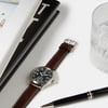 Ordinance watch with broad dial, broad luminous indices and hands. Japan quartz movement with seconds registers. Hack feature.