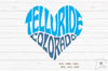 This design features the words Telluride Colorado, creatively made in the shape of a heart.