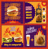 Plantilla Super Burguer 1, diseño ideal para venta de Comidas Rápidas. Edita textos, colores, imágenes y elementos fácilmente adaptando estos diseños a la temática de tu emprendimiento / negocio usando nuestras plantillas para Canva.