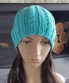 This cable and 2x2 rib beanie in Merino yarn includes an optional turn up brim and features a simple four row cable pattern.