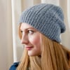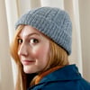 The hat is worked circularly from the bottom up. The patterning on the hat consists of a combination of seed stitch, ribbing, and easy twisted-stitch cables. The pattern is worked from a chart.