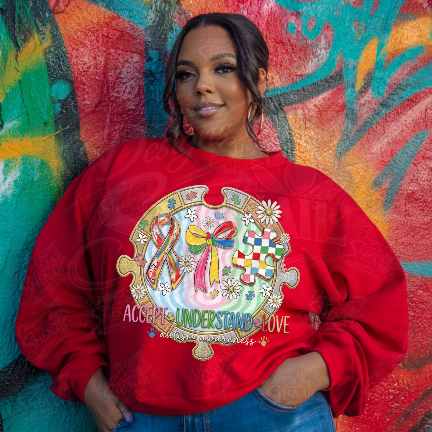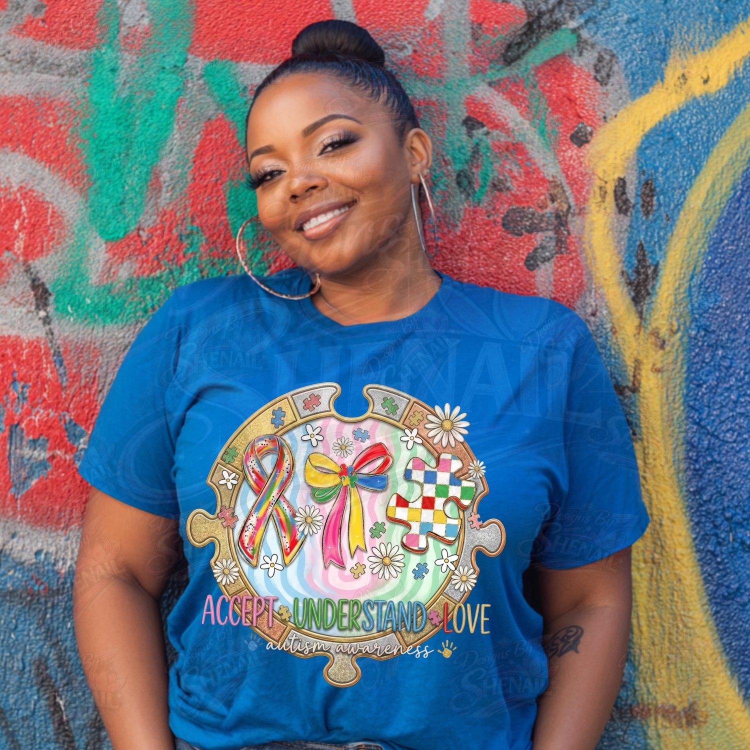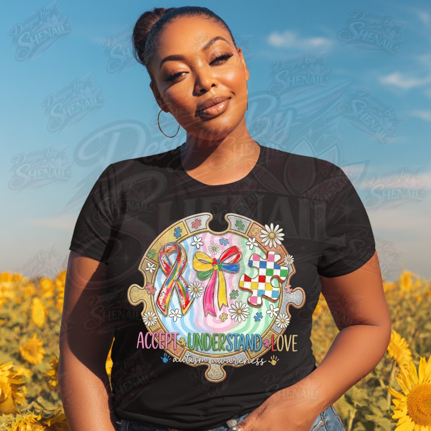 Show support, acceptance, and love with this Autism Awareness PNG design featuring the message “Accept • Understand • Love.” The artwork includes colorful autism puzzle pieces, awareness ribbon, bow, and cheerful daisies, symbolizing compassion, neurodiversity, and advocacy.