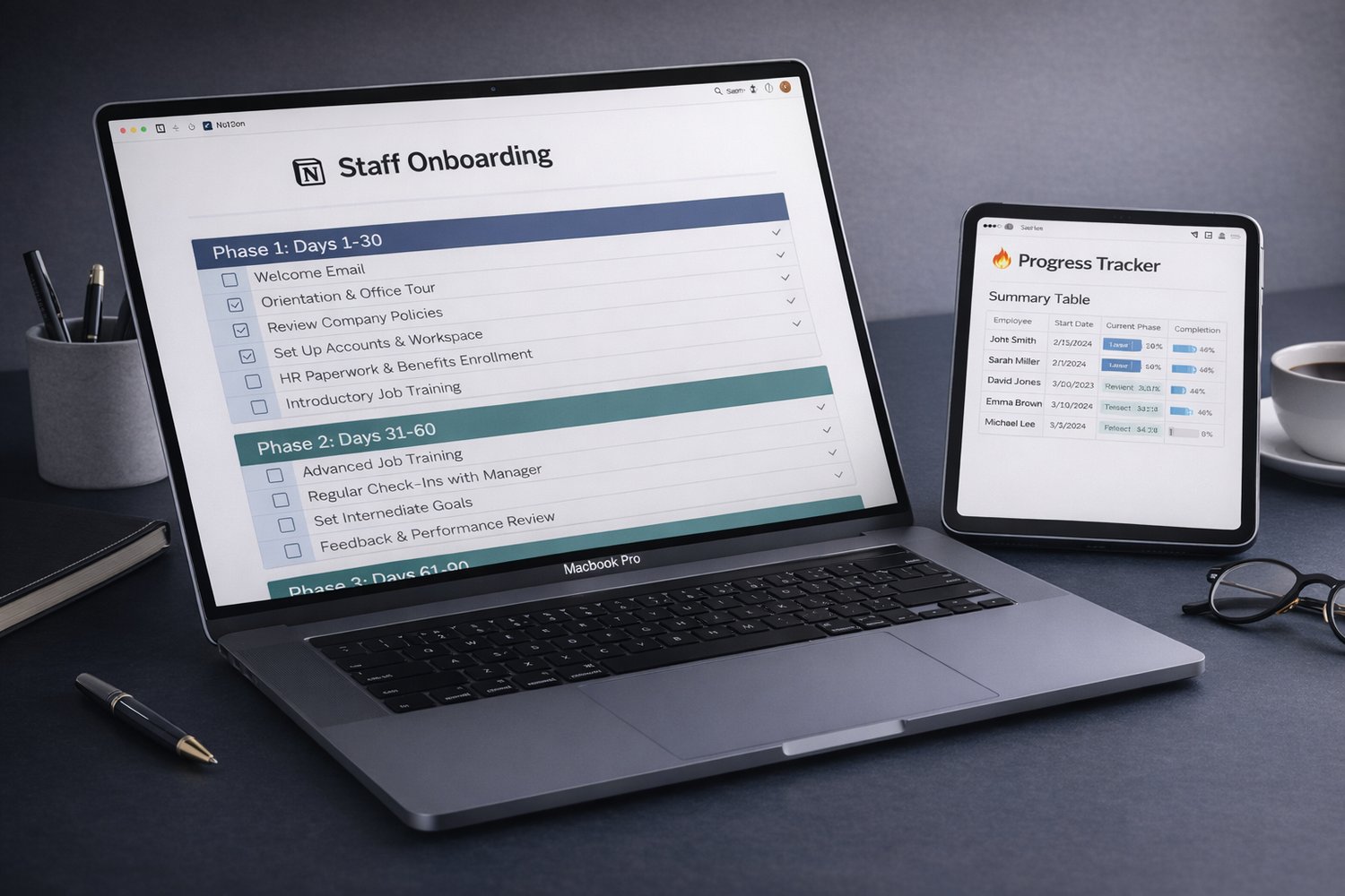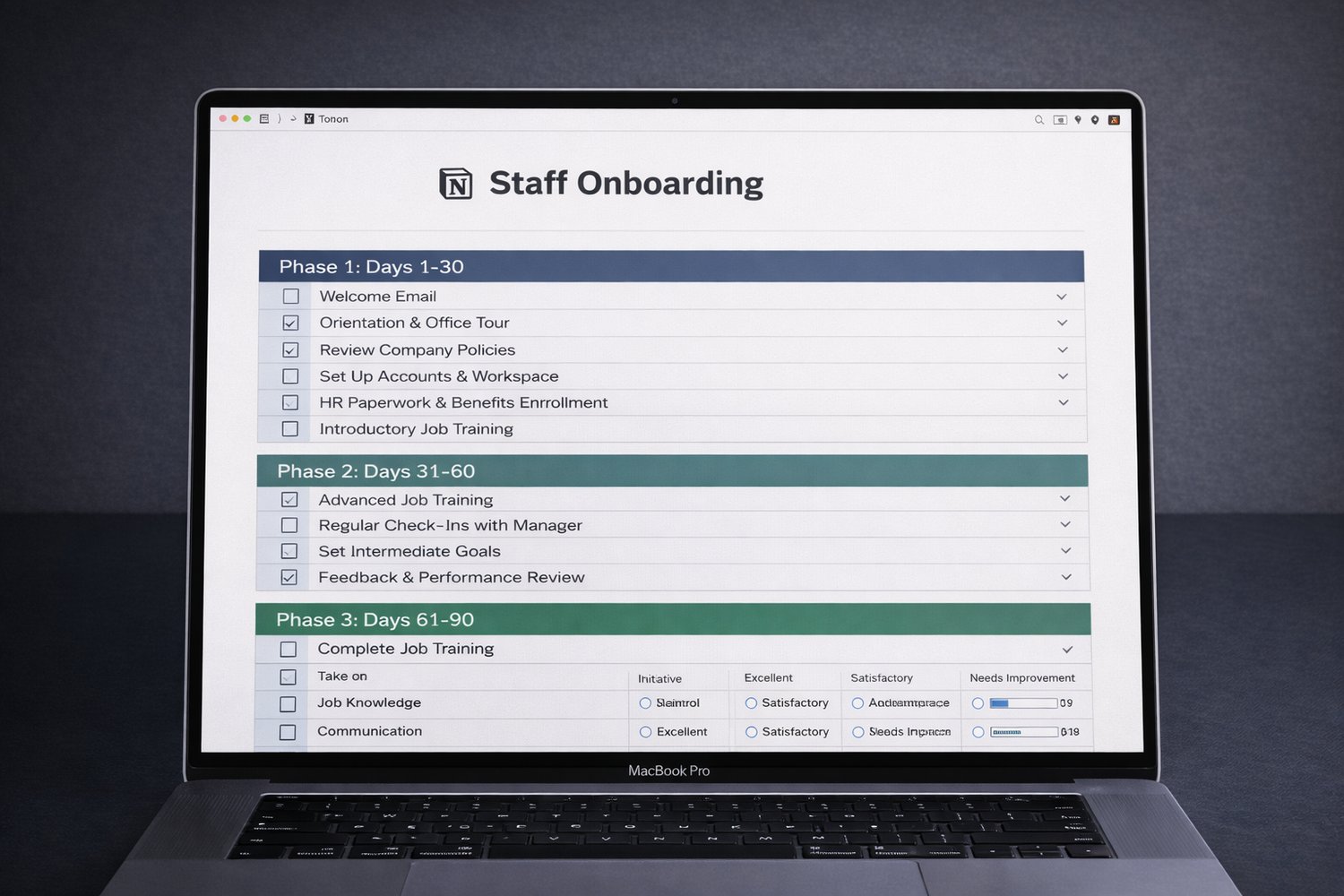 - โ Week-by-week checklists covering orientation, systems, workflows, and independence milestones