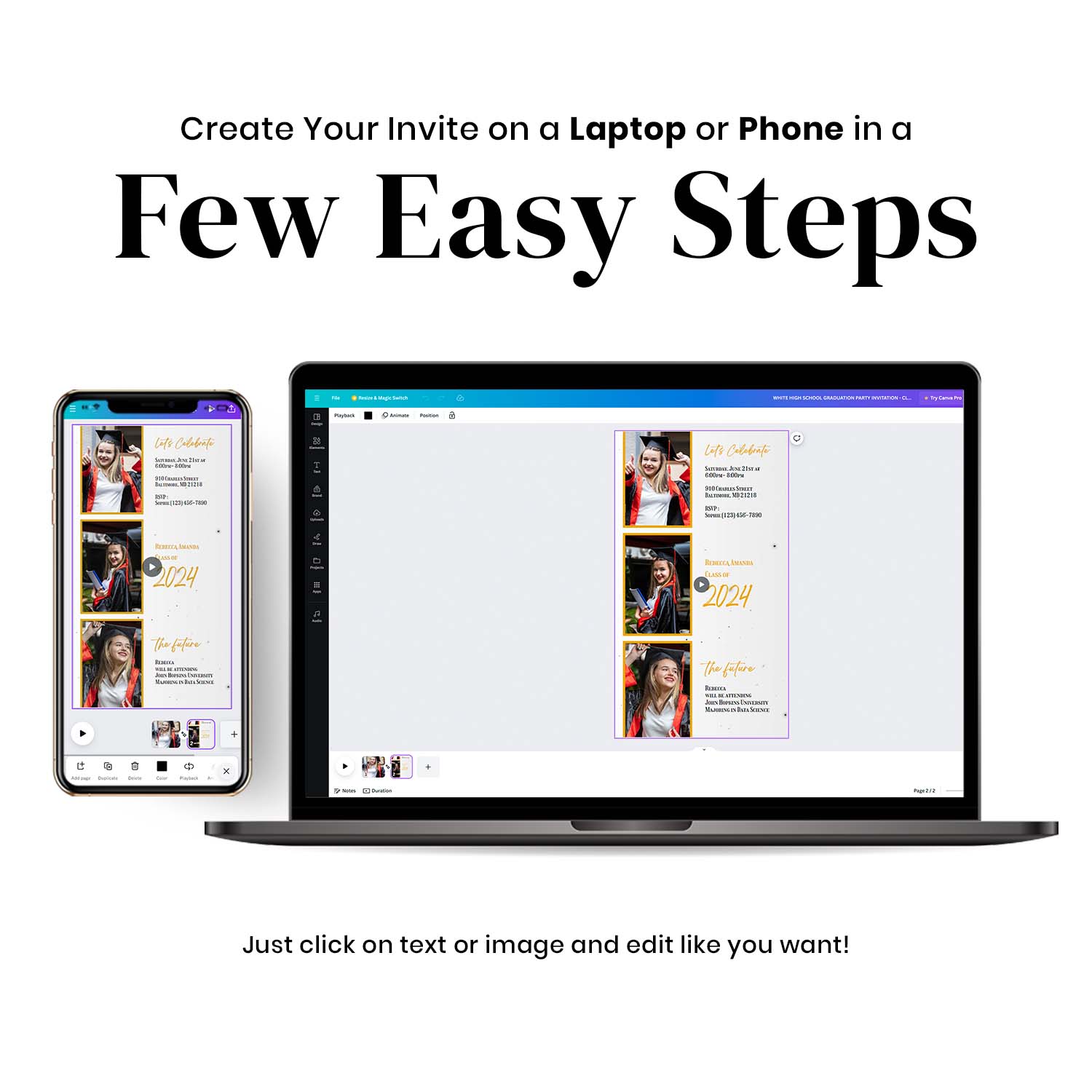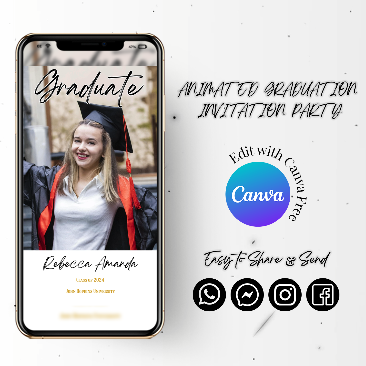 Invite your guests to your graduation event with a unique and modern touch using this special animated graduation party invitation templates. With the convenience of a video text message, it’s quick and easy to send. This template provides instant access without any need for installation.