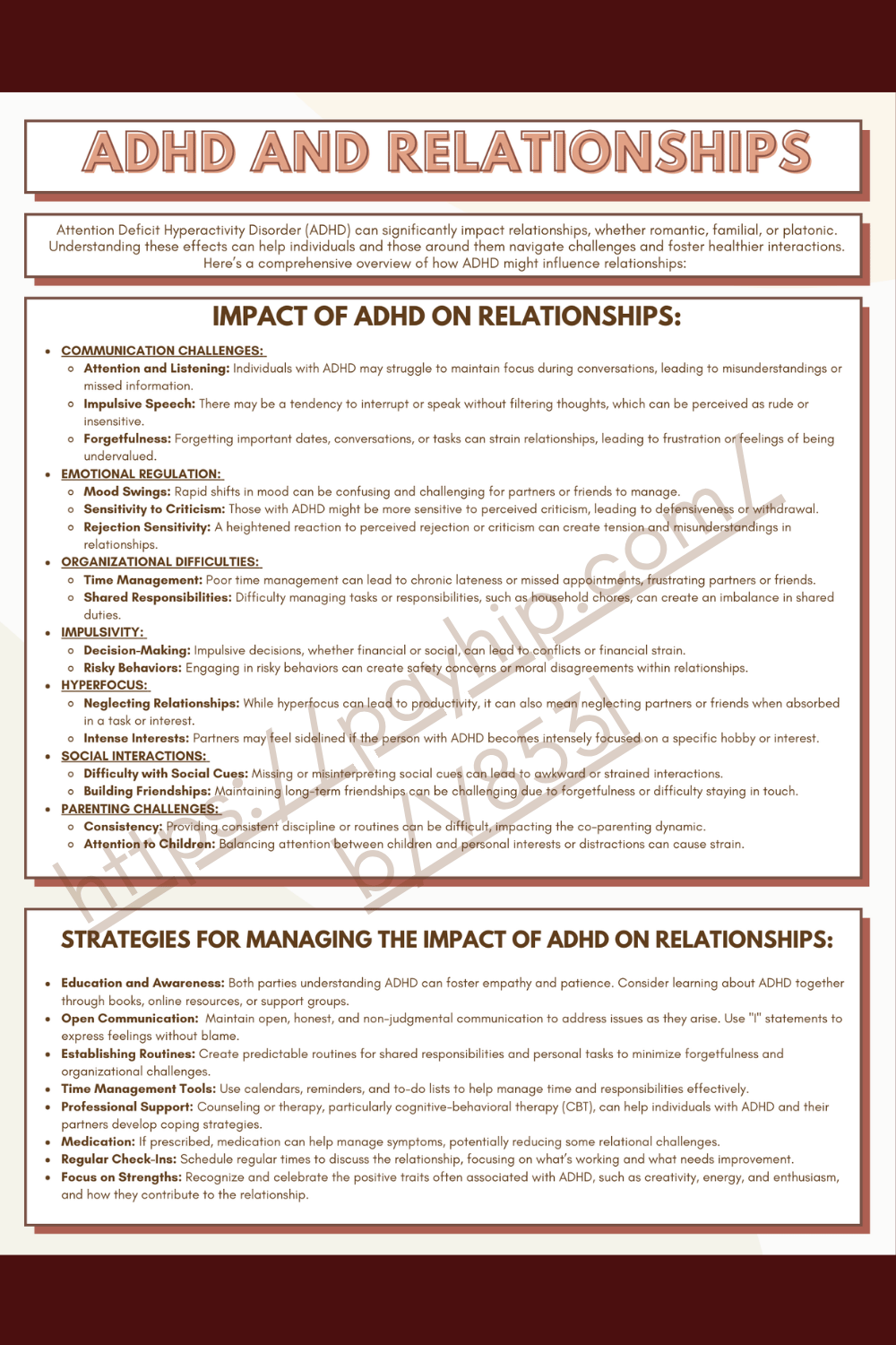 Attention Deficit Hyperactivity Disorder (ADHD) can significantly impact relationships, whether romantic, familial, or platonic. Understanding these effects can help individuals and those around them navigate challenges and foster healthier interactions.This worksheet gives a comprehensive overview of how ADHD might influence relationships, as well as ways to manage some of those impacts.