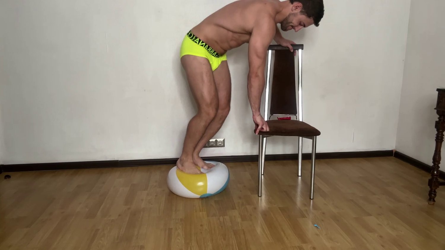 - The climax builds with a beachball. He inflates it and takes on the ultimate challenge: attempting to burst it using only the force of his feet and backside. Witness maximum tension, the latex straining to its limit in a power struggle where the beachball fights back... will he finally conquer it?