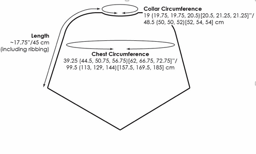 39.25 (44.5, 50.75, 56.75)62, 66.75, 72.75” / 99.5 (113, 129, 144)157.5, 169.5, 185 cm circumference at full bust. This is designed to be worn with 4-6” of positive ease, so take your bust measurement and add 4-6” to determine the size that you will knit. When in doubt, size up, not down.