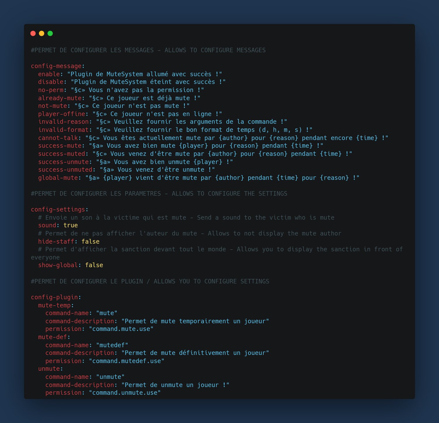 Un plugin de MuteSystem, celui-ci vous permettra en cas d'infraction de mute des joueurs, définitivement ou temporairement, vous aurez la possibilité de pouvoir révoquer leurs mute, choisir si l'auteur du mute est affiché, si le mute est affiché en public et bien d'autres paramètres.