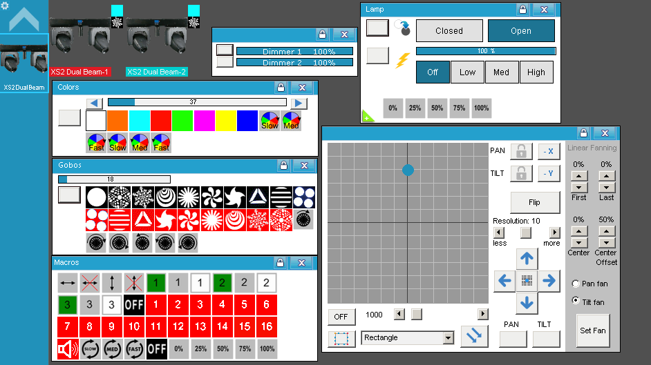 • Dimmer individual de cada cabezal con faders, o de los dos cabezales juntos en valores Fijos con Macros (0%, 25%, 50%, 100%)