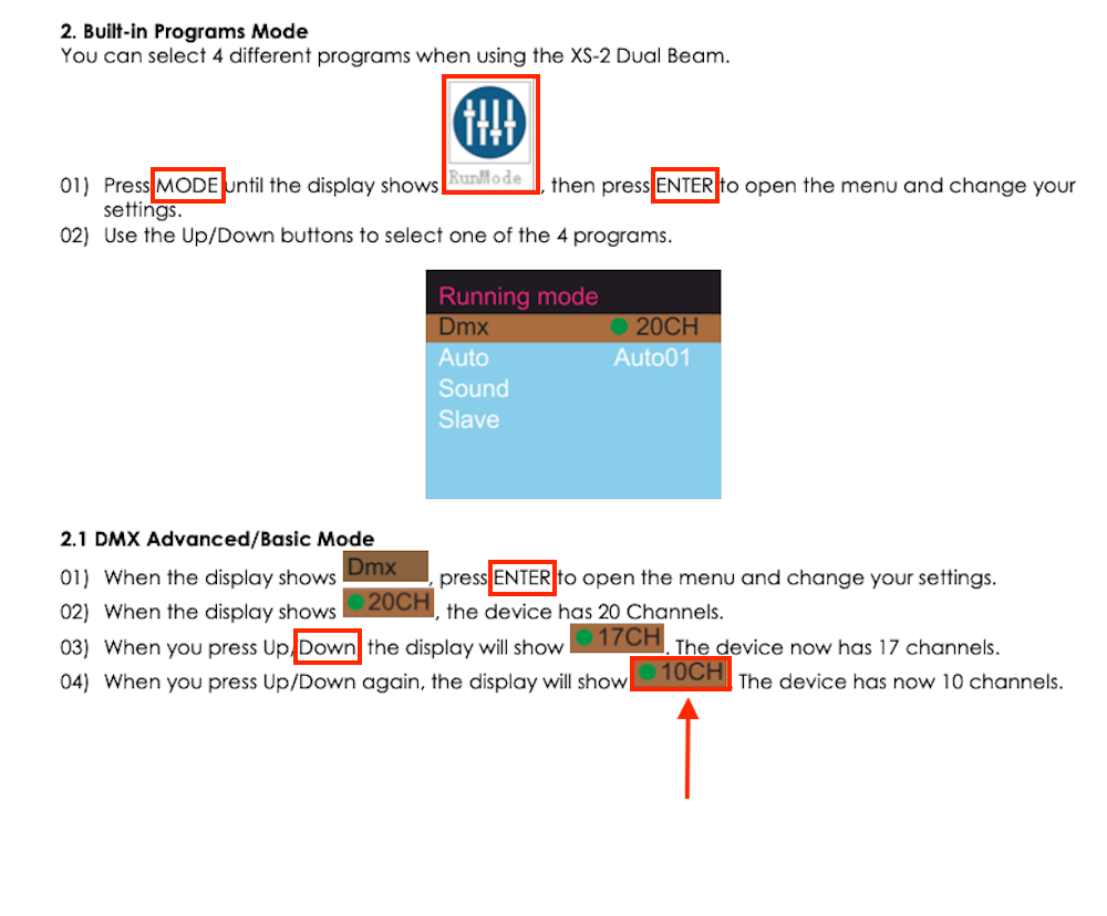 * Verifique en su equipo entrando al Menu "CHNd" si muestra los modos "10CH", "17CH" y "20CH". Si muestra otros modos este Fixture no servirá.