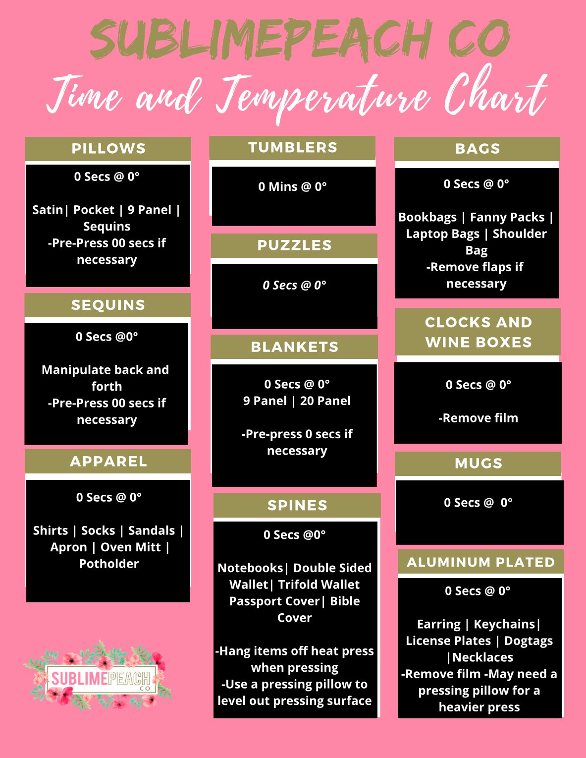 This comprehensive resource provides precise time and temperature settings for a wide range of sublimation materials, ensuring flawless results every time. Whether you’re working with fabrics, mugs, tiles, or other substrates, you'll find detailed instructions to achieve vibrant colors and crisp designs. Designed to simplify your crafting process, this guide takes the guesswork out of sublimation, allowing you to focus on unleashing your creativity. Ideal for both beginners and experienced crafters, it helps you optimize your heat press or oven settings for consistent, professional-quality results. Elevate your sublimation projects with confidence and ease