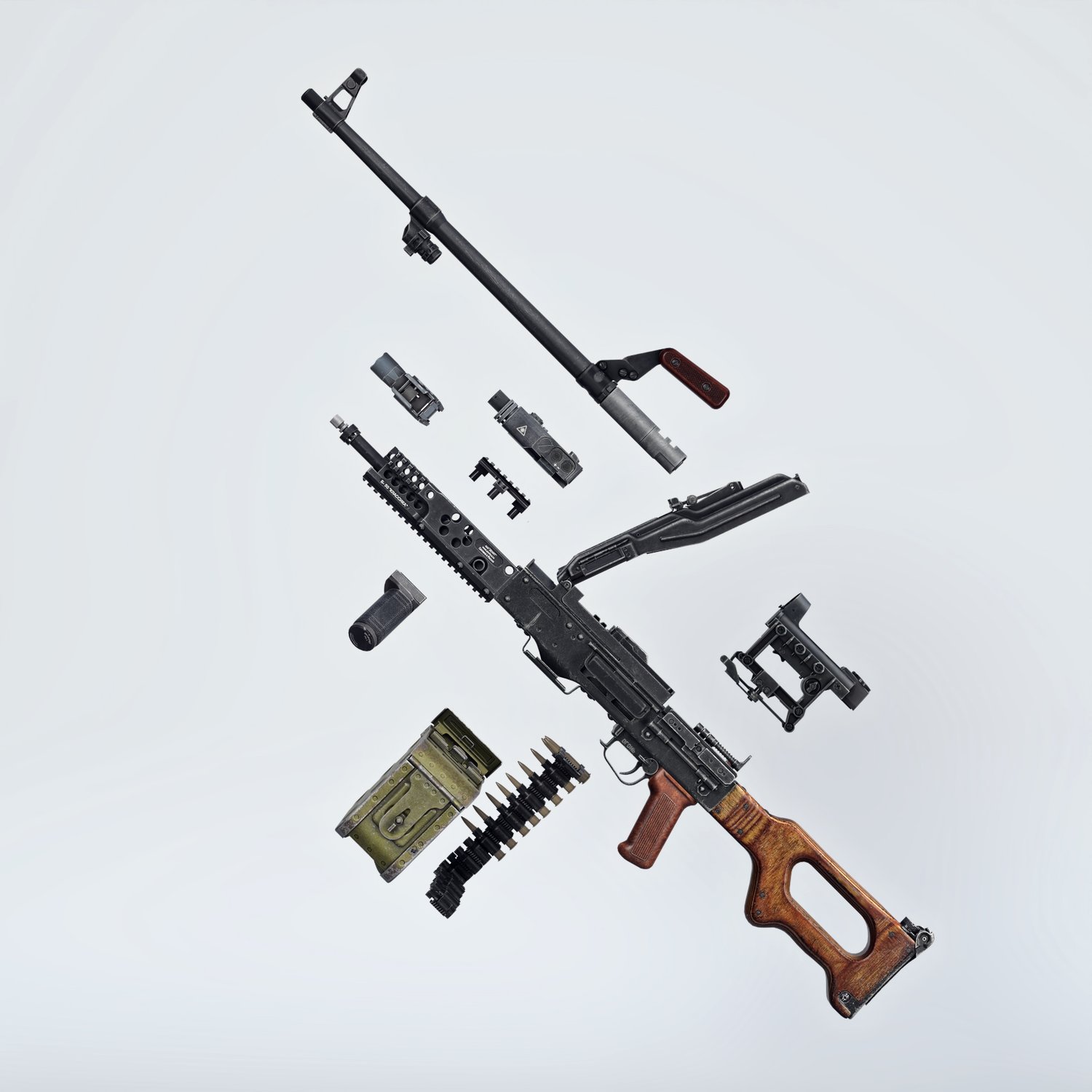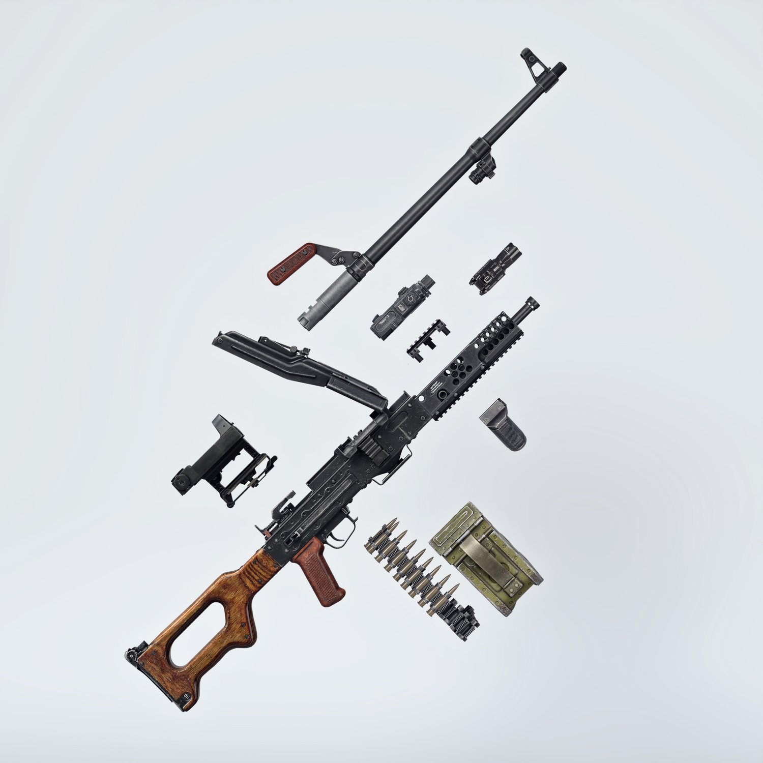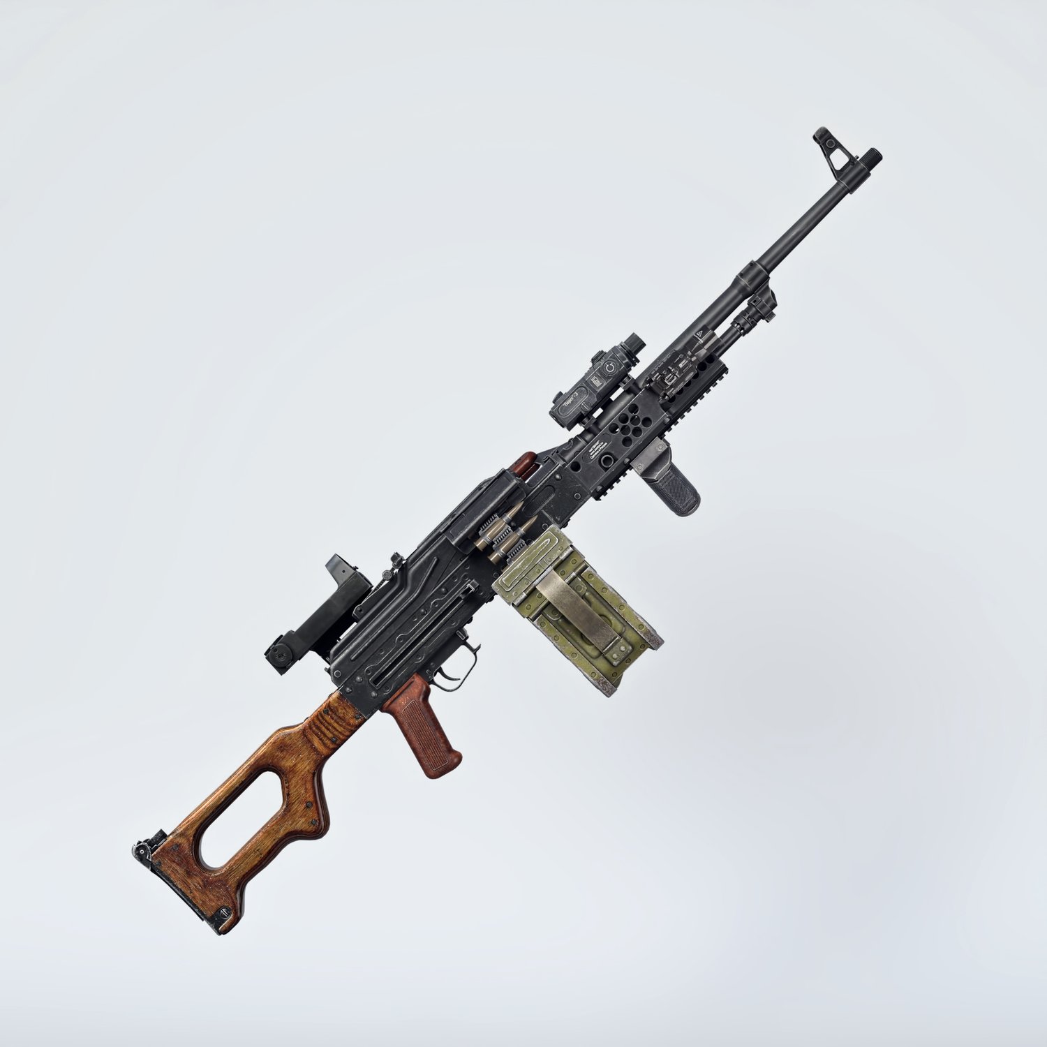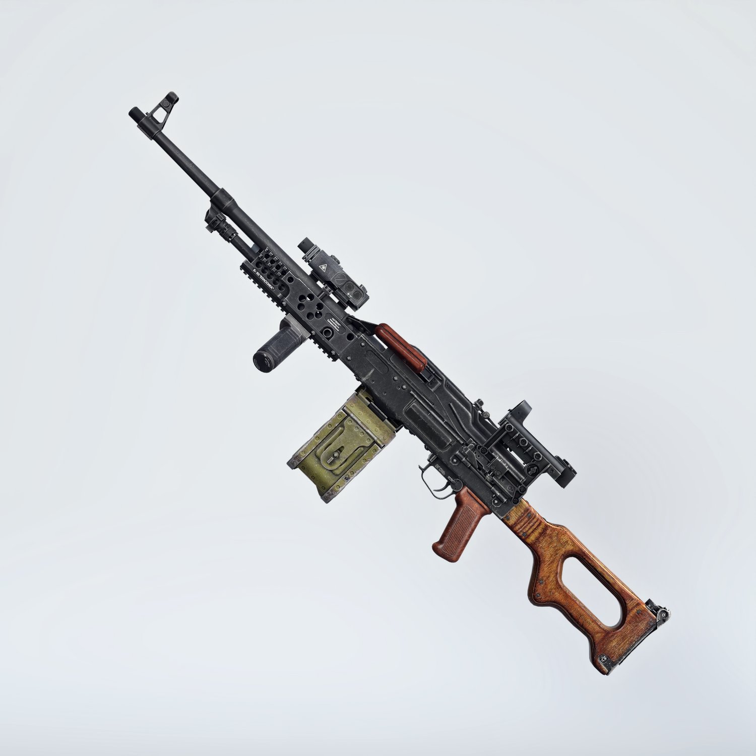 Developed in the 90s and a replacement for existing medium machineguns, this Post Soviet machinegun provides a reliable sustained gun power. It also looks cook, so that's a plus. Good looking, with plenty of accessories to configure your gun. The prop is rigged and converted for use with DAZ. Trigger, charging handle, bolt, etc also rigged for more realistic pictures. Includes a red dot, a drum mag, laser, flashlight and a front grip. Has a lot of picatinny rails for any attachments you have. All can be hidden if needed. This is a tactical version.