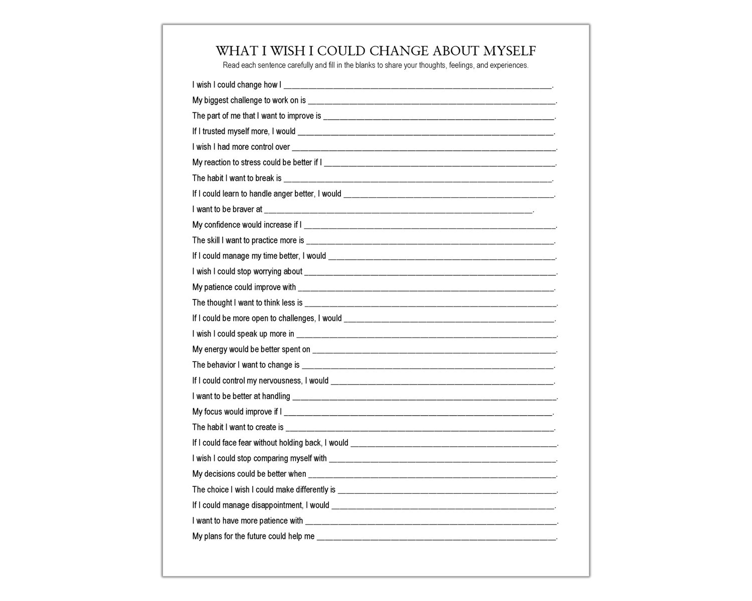 Changing how we act or think starts by being brave enough to admit what isn’t working. This What I Wish I Could Change About Myself worksheet features 30 prompts to help you identify what you’d like to leave behind and what you’d like to embrace. Use it for therapy sessions, journaling, or self-reflection to see your goals more clearly and understand what matters most to your heart. Trust yourself to grow into the person you are meant to be.